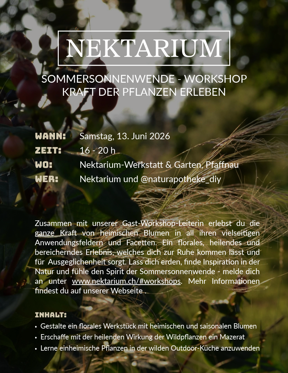 Geben Sie Ihre Eventfloristik in fachkundige Hände oder geniessen Sie eine kreative Auszeit an einem unserer Nektarium-Workshops.